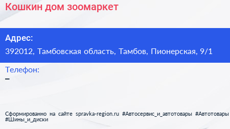 Кошкин дом, зоомаркет по адресу 392012, Тамбовская область, Тамбов, Пионерская, 9/1 в дальнейшем Организация, размещена в следующих категориях: