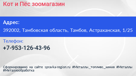 Кот и Пёс, зоомагазин по адресу 392002, Тамбовская область, Тамбов, Астраханская, 1/25 в дальнейшем Организация, размещена в следующих категориях: