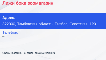Лижи бока, зоомагазин по адресу 392000, Тамбовская область, Тамбов, Советская, 190 в дальнейшем Организация, размещена в следующих категориях: