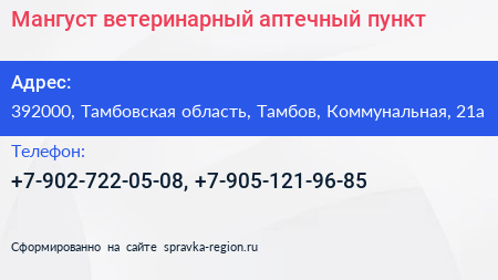 Мангуст, ветеринарный аптечный пункт по адресу 392000, Тамбовская область, Тамбов, Коммунальная, 21а в дальнейшем Организация, размещена в следующих категориях: