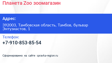 Планета Zoo, зоомагазин по адресу 392003, Тамбовская область, Тамбов, бульвар Энтузиастов, 1 в дальнейшем Организация, размещена в следующих категориях:
