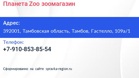 Планета Zoo, зоомагазин по адресу 392001, Тамбовская область, Тамбов, Гастелло, 109а/1 в дальнейшем Организация, размещена в следующих категориях:
