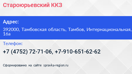 Староюрьевский ККЗ по адресу 392000, Тамбовская область, Тамбов, Интернациональная, 16а в дальнейшем Организация, размещена в следующих категориях: