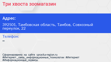 Три хвоста, зоомагазин по адресу 392501, Тамбовская область, Тамбов, Совхозный переулок, 22 в дальнейшем Организация, размещена в следующих категориях: