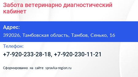 Забота, ветеринарно-диагностический кабинет по адресу 392026, Тамбовская область, Тамбов, Сенько, 16 в дальнейшем Организация, размещена в следующих категориях: