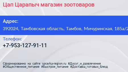 Цап Царапыч, магазин зоотоваров по адресу 392024, Тамбовская область, Тамбов, Мичуринская, 185а/2 в дальнейшем Организация, размещена в следующих категориях: