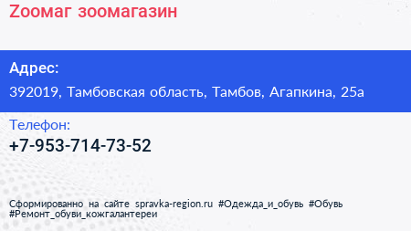 Zоомаг, зоомагазин по адресу 392019, Тамбовская область, Тамбов, Агапкина, 25а в дальнейшем Организация, размещена в следующих категориях: