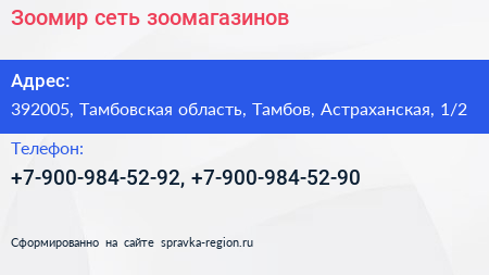 Зоомир, сеть зоомагазинов по адресу 392005, Тамбовская область, Тамбов, Астраханская, 1/2 в дальнейшем Организация, размещена в следующих категориях: