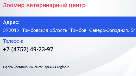Зоомир, ветеринарный центр по адресу 392019, Тамбовская область, Тамбов, Северо-Западная, 5г в дальнейшем Организация, размещена в следующих категориях:
