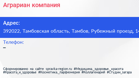 Аграриан, компания по адресу 392022, Тамбовская область, Тамбов, Рубежный проезд, 14 в дальнейшем Организация, размещена в следующих категориях: