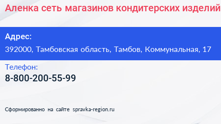 Аленка, сеть магазинов кондитерских изделий по адресу 392000, Тамбовская область, Тамбов, Коммунальная, 17 в дальнейшем Организация, размещена в следующих категориях: