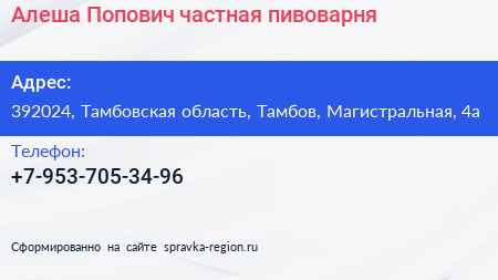 Алеша Попович, частная пивоварня по адресу 392024, Тамбовская область, Тамбов, Магистральная, 4а в дальнейшем Организация, размещена в следующих категориях: