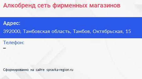 Алкобренд, сеть фирменных магазинов по адресу 392000, Тамбовская область, Тамбов, Октябрьская, 15 в дальнейшем Организация, размещена в следующих категориях: