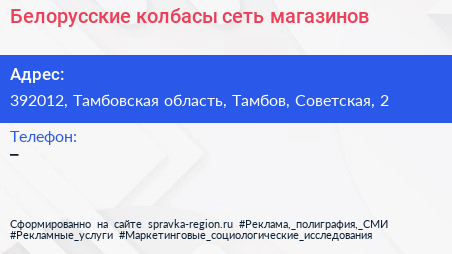 Белорусские колбасы, сеть магазинов по адресу 392012, Тамбовская область, Тамбов, Советская, 2 в дальнейшем Организация, размещена в следующих категориях: