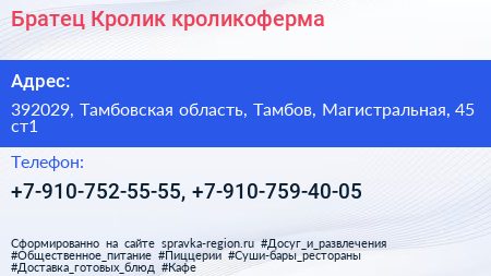 Братец Кролик, кроликоферма по адресу 392029, Тамбовская область, Тамбов, Магистральная, 45 ст1 в дальнейшем Организация, размещена в следующих категориях: