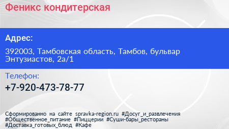 Феникс, кондитерская по адресу 392003, Тамбовская область, Тамбов, бульвар Энтузиастов, 2а/1 в дальнейшем Организация, размещена в следующих категориях:
