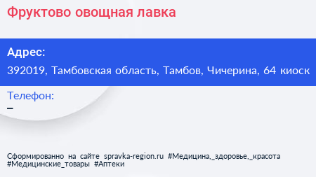 Фруктово-овощная лавка по адресу 392019, Тамбовская область, Тамбов, Чичерина, 64 киоск в дальнейшем Организация, размещена в следующих категориях: