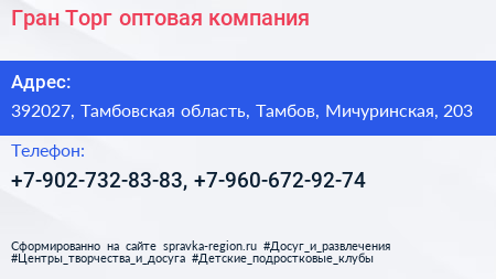 Гран Торг, оптовая компания по адресу 392027, Тамбовская область, Тамбов, Мичуринская, 203 в дальнейшем Организация, размещена в следующих категориях: