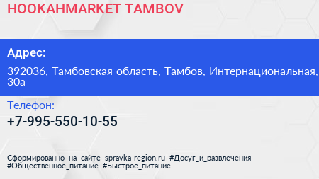 HOOKAHMARKET TAMBOV по адресу 392036, Тамбовская область, Тамбов, Интернациональная, 30а в дальнейшем Организация, размещена в следующих категориях: