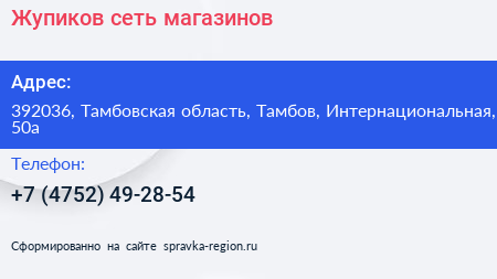 Жупиков, сеть магазинов по адресу 392036, Тамбовская область, Тамбов, Интернациональная, 50а в дальнейшем Организация, размещена в следующих категориях: