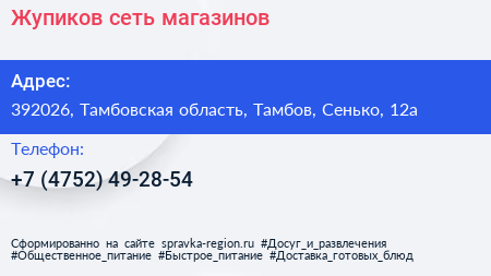 Жупиков, сеть магазинов по адресу 392026, Тамбовская область, Тамбов, Сенько, 12а в дальнейшем Организация, размещена в следующих категориях: