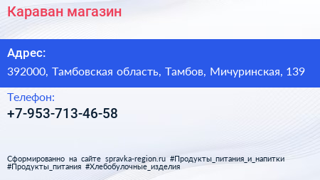 Караван, магазин по адресу 392000, Тамбовская область, Тамбов, Мичуринская, 139 в дальнейшем Организация, размещена в следующих категориях: