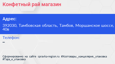 Конфетный рай, магазин по адресу 392030, Тамбовская область, Тамбов, Моршанское шоссе, 40в в дальнейшем Организация, размещена в следующих категориях: