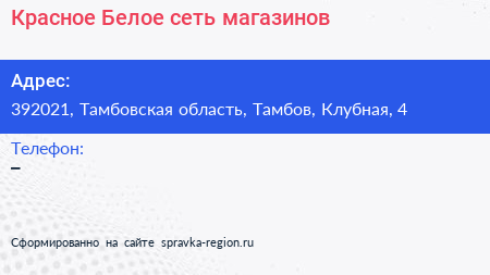 Красное & Белое, сеть магазинов по адресу 392021, Тамбовская область, Тамбов, Клубная, 4 в дальнейшем Организация, размещена в следующих категориях: