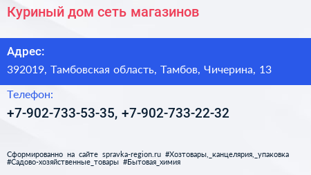Куриный дом, сеть магазинов по адресу 392019, Тамбовская область, Тамбов, Чичерина, 13 в дальнейшем Организация, размещена в следующих категориях: