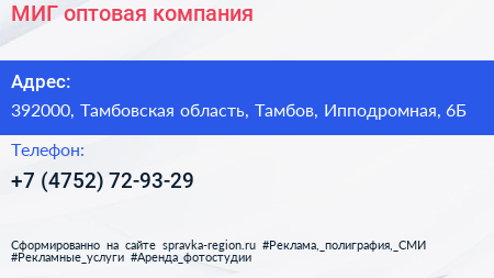 МИГ, оптовая компания по адресу 392000, Тамбовская область, Тамбов, Ипподромная, 6Б в дальнейшем Организация, размещена в следующих категориях: