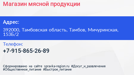 Магазин мясной продукции по адресу 392000, Тамбовская область, Тамбов, Мичуринская, 153Б/2 в дальнейшем Организация, размещена в следующих категориях: