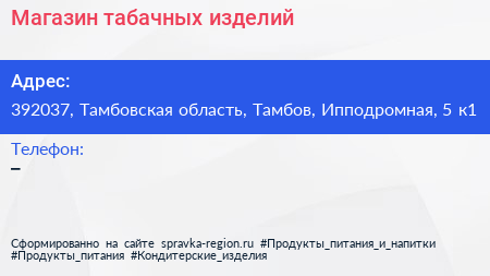 Магазин табачных изделий по адресу 392037, Тамбовская область, Тамбов, Ипподромная, 5 к1 в дальнейшем Организация, размещена в следующих категориях: