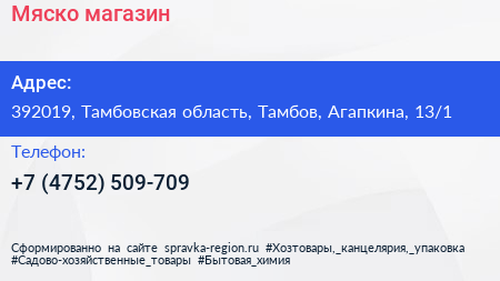 Мяско, магазин по адресу 392019, Тамбовская область, Тамбов, Агапкина, 13/1 в дальнейшем Организация, размещена в следующих категориях: