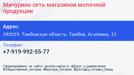Мичурино, сеть магазинов молочной продукции по адресу 392019, Тамбовская область, Тамбов, Агапкина, 15 в дальнейшем Организация, размещена в следующих категориях: