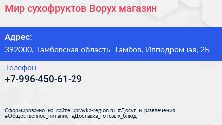 Мир сухофруктов Ворух, магазин по адресу 392000, Тамбовская область, Тамбов, Ипподромная, 2Б в дальнейшем Организация, размещена в следующих категориях: