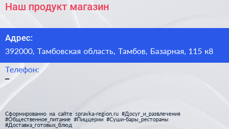 Наш продукт, магазин по адресу 392000, Тамбовская область, Тамбов, Базарная, 115 к8 в дальнейшем Организация, размещена в следующих категориях: