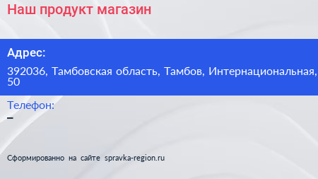 Наш продукт, магазин по адресу 392036, Тамбовская область, Тамбов, Интернациональная, 50 в дальнейшем Организация, размещена в следующих категориях: