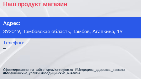 Наш продукт, магазин по адресу 392019, Тамбовская область, Тамбов, Агапкина, 19 в дальнейшем Организация, размещена в следующих категориях: