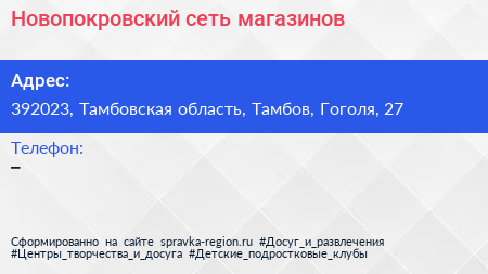 Новопокровский, сеть магазинов по адресу 392023, Тамбовская область, Тамбов, Гоголя, 27 в дальнейшем Организация, размещена в следующих категориях: