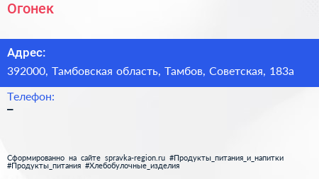 Огонек по адресу 392000, Тамбовская область, Тамбов, Советская, 183а в дальнейшем Организация, размещена в следующих категориях: