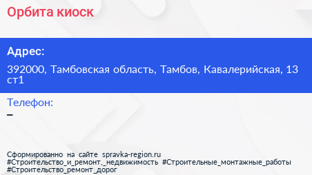 Орбита, киоск по адресу 392000, Тамбовская область, Тамбов, Кавалерийская, 13 ст1 в дальнейшем Организация, размещена в следующих категориях: