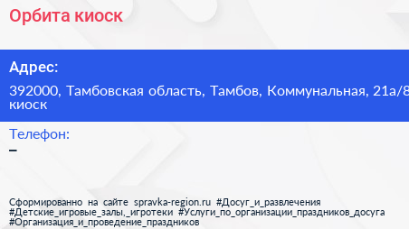 Орбита, киоск по адресу 392000, Тамбовская область, Тамбов, Коммунальная, 21а/8 киоск в дальнейшем Организация, размещена в следующих категориях: