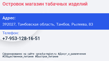 Островок, магазин табачных изделий по адресу 392027, Тамбовская область, Тамбов, Рылеева, 83 в дальнейшем Организация, размещена в следующих категориях: