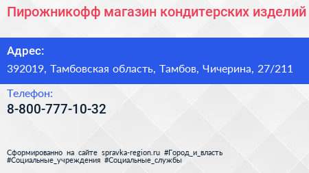 Пирожникофф, магазин кондитерских изделий по адресу 392019, Тамбовская область, Тамбов, Чичерина, 27/211 в дальнейшем Организация, размещена в следующих категориях: