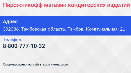 Пирожникофф, магазин кондитерских изделий по адресу 392036, Тамбовская область, Тамбов, Коммунальная, 21 в дальнейшем Организация, размещена в следующих категориях: