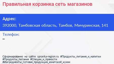 Правильная корзинка, сеть магазинов по адресу 392000, Тамбовская область, Тамбов, Мичуринская, 141 в дальнейшем Организация, размещена в следующих категориях: