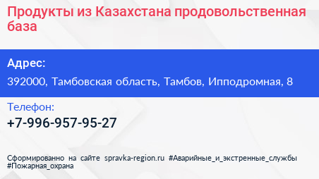 Продукты из Казахстана, продовольственная база по адресу 392000, Тамбовская область, Тамбов, Ипподромная, 8 в дальнейшем Организация, размещена в следующих категориях: