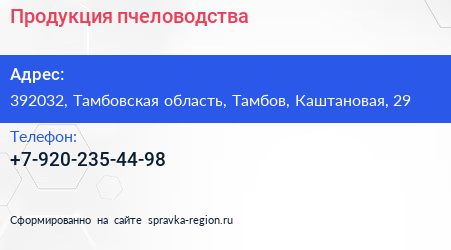 Продукция пчеловодства по адресу 392032, Тамбовская область, Тамбов, Каштановая, 29 в дальнейшем Организация, размещена в следующих категориях: