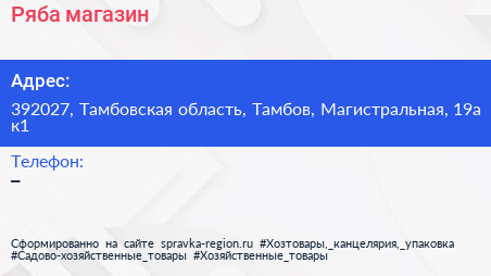 Ряба, магазин по адресу 392027, Тамбовская область, Тамбов, Магистральная, 19а к1 в дальнейшем Организация, размещена в следующих категориях: