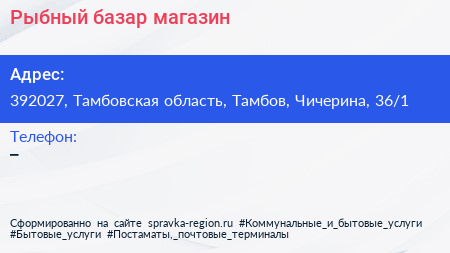 Рыбный базар, магазин по адресу 392027, Тамбовская область, Тамбов, Чичерина, 36/1 в дальнейшем Организация, размещена в следующих категориях: